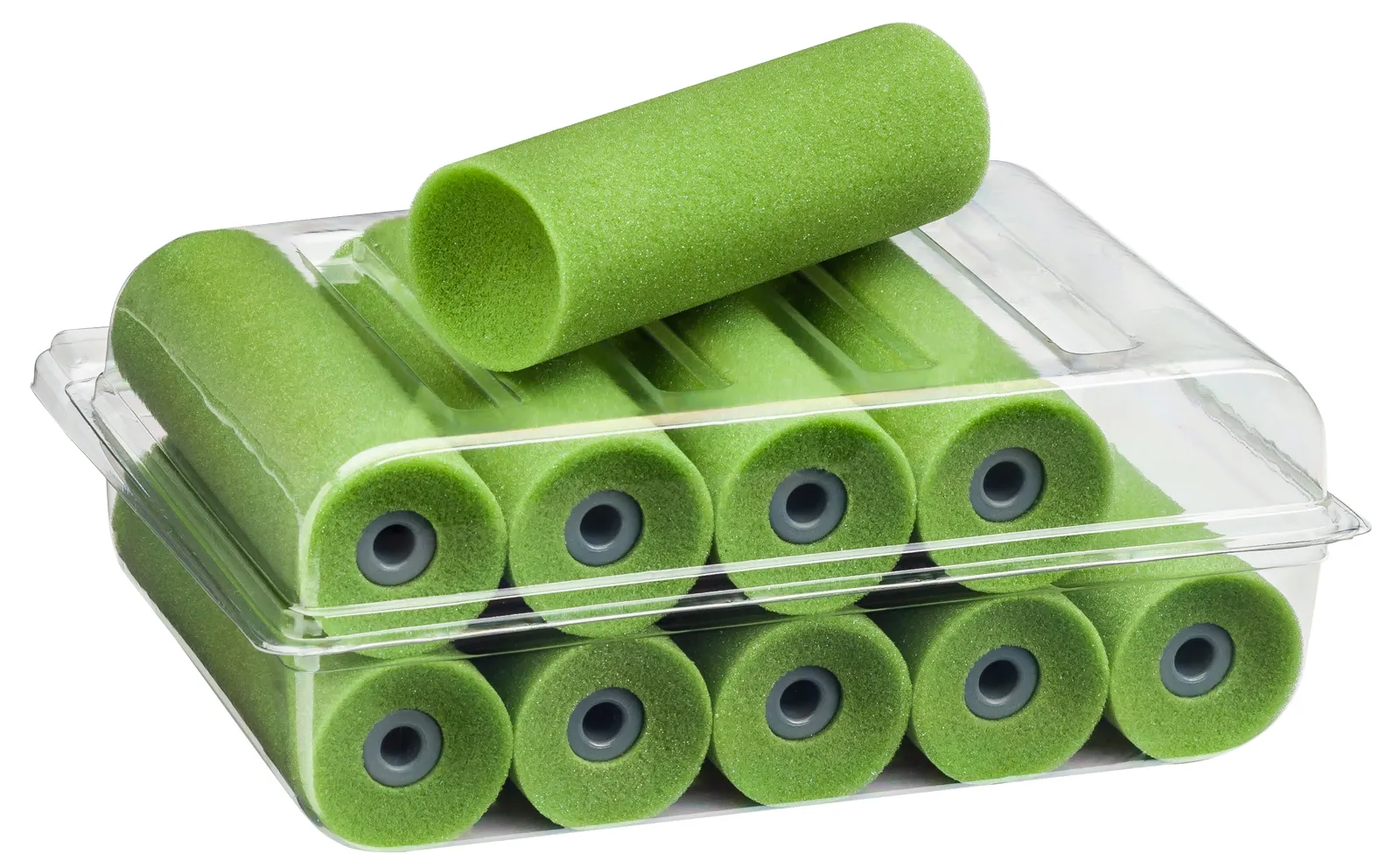 Das ultimative Set für streifenfreie Lackierungen: Erhalten Sie 10 Premium-Schaumwalzen „Performance STAR“ (11 cm) mit konkaven Enden inklusive einem rostfreien Edelstahl-Bügel. Die speziell perforierte, superfeine Struktur garantiert ein perfektes Oberflächenfinish bei wasserbasierten und leicht lösemittelhaltigen Lacken – ohne Kantenabdrücke.