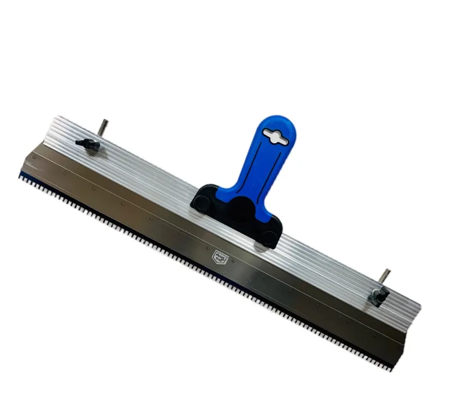 Gezahnter Großflächenrakel mit 560 mm Breite aus rostfreiem Edelstahl für den gleichmäßigen Auftrag von Bodenbeschichtungsmassen.