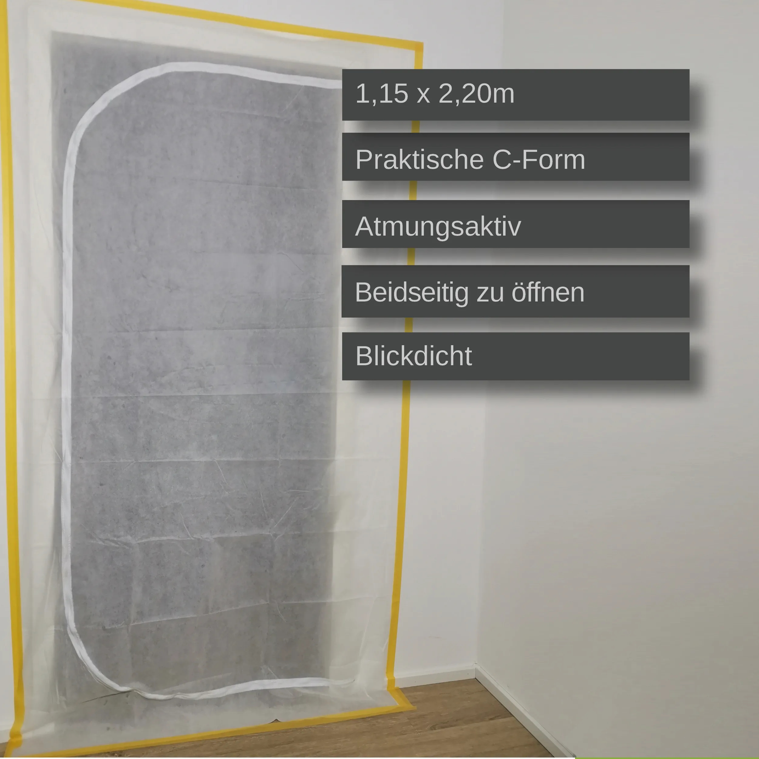 Vlies-Staubschutztür mit eingenähtem C-Reißverschluss – die flexible Lösung für Profis und anspruchsvolle Heimwerker.