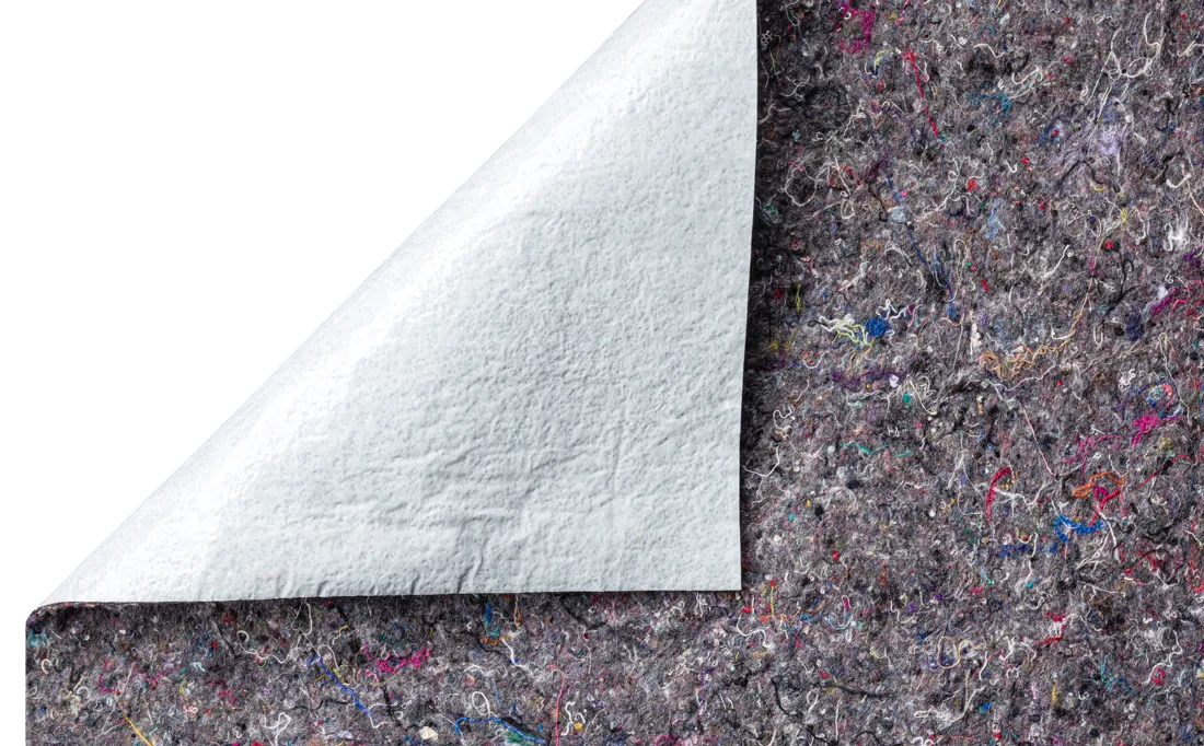 - Vielfach vernadelte, feuchtigkeitsabweisende "Anti Dröhn" Recycling Fasern mit 300g/m² Grammatur für optimale Schallminderung und angenehm tief klingendem Begehungsklang